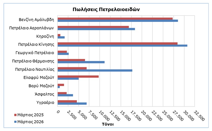 Οι ολικές πωλήσεις πετρελαιοειδών κατά τον μήνα Μάρτιο 2026 σε σύγκριση με τον Φεβρουάριο 2026 σημείωσαν άνοδο 13,7%. Ενδεικτικά, αυξήθηκαν οι προμήθειες πετρελαίου σε αεροπλάνα (16,9%) και σε πλοία (9,1%), καθώς και οι πωλήσεις πετρελαίου κίνησης (15,7%) και βενζίνης (11,2%).Τα ολικά αποθέματα πετρελαιοειδών στο τέλος Μαρτίου 2026 αυξήθηκαν κατά 4,1% σε σχέση με το τέλος του προηγούμενου μήνα.