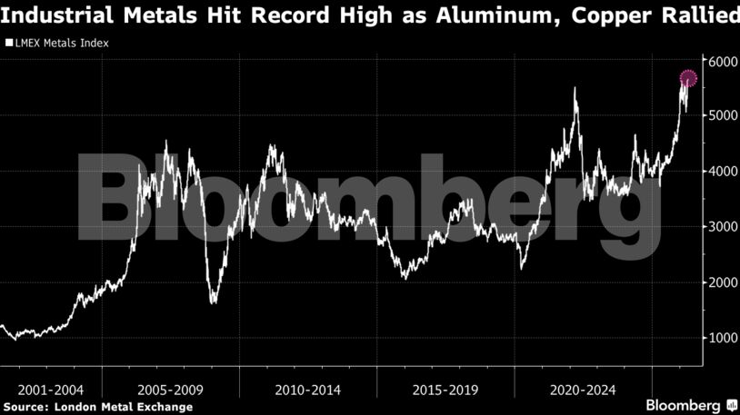 Τα βιομηχανικά μέταλλα εκτινάχθηκαν σε ιστορικά υψηλά επίπεδα στο Χρηματιστήριο Μετάλλων του Λονδίνου, με οδηγό την άνοδο του αλουμινίου μετά τις διαταραχές στην προσφορά λόγω του πολέμου στη Μέση Ανατολή, αλλά και την πρόσφατη δυναμική επιστροφή του χαλκού.