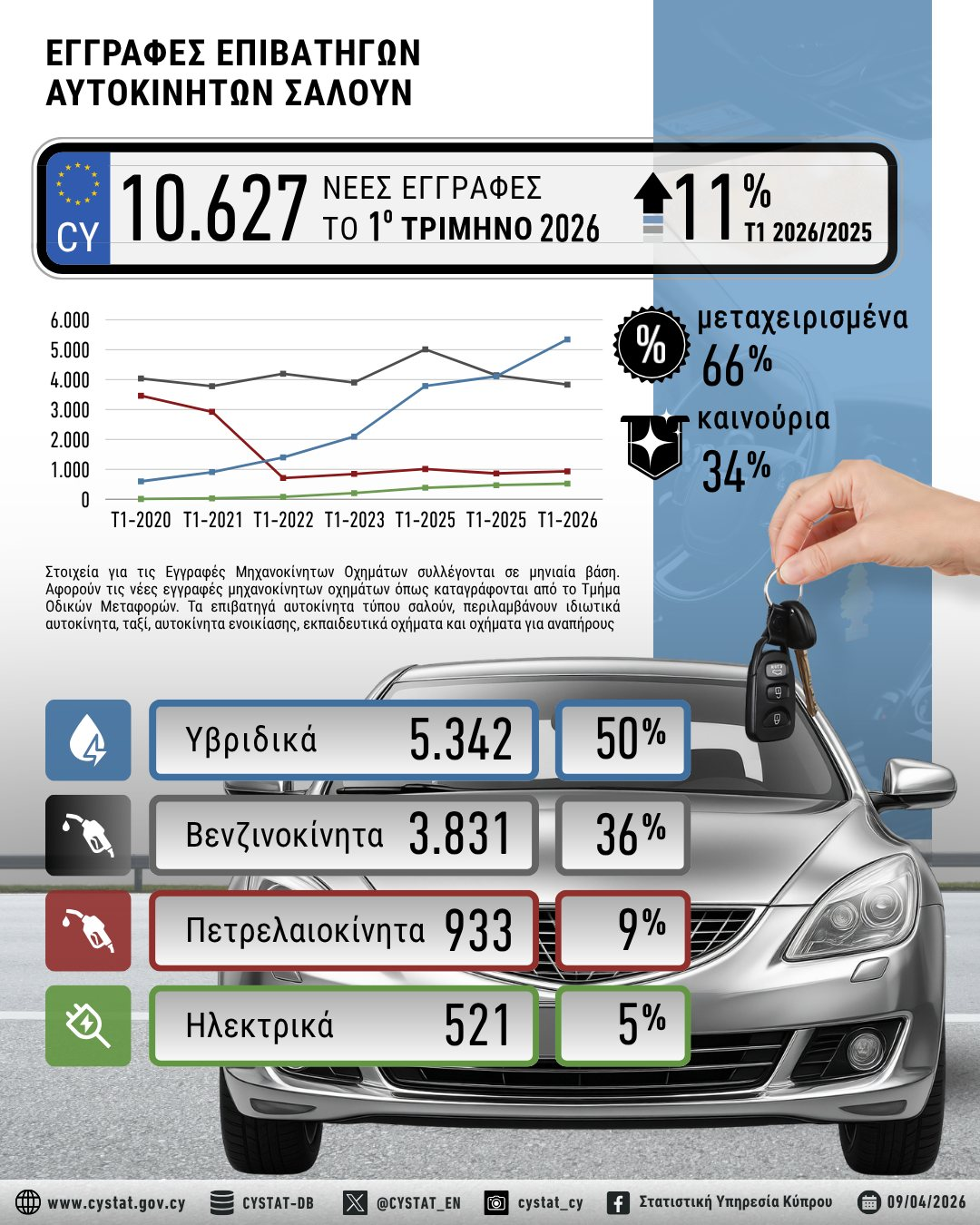 Σύμφωνα με την Στατιστική Υπηρεσίας, οι κυριότερες εξελίξεις που σημειώθηκαν στις εγγραφές οχημάτων κατά την περίοδο Ιανουαρίου-Μαρτίου 2026, σε σύγκριση με την αντίστοιχη περίοδο του 2025, συνοψίζονται στα ακόλουθα: