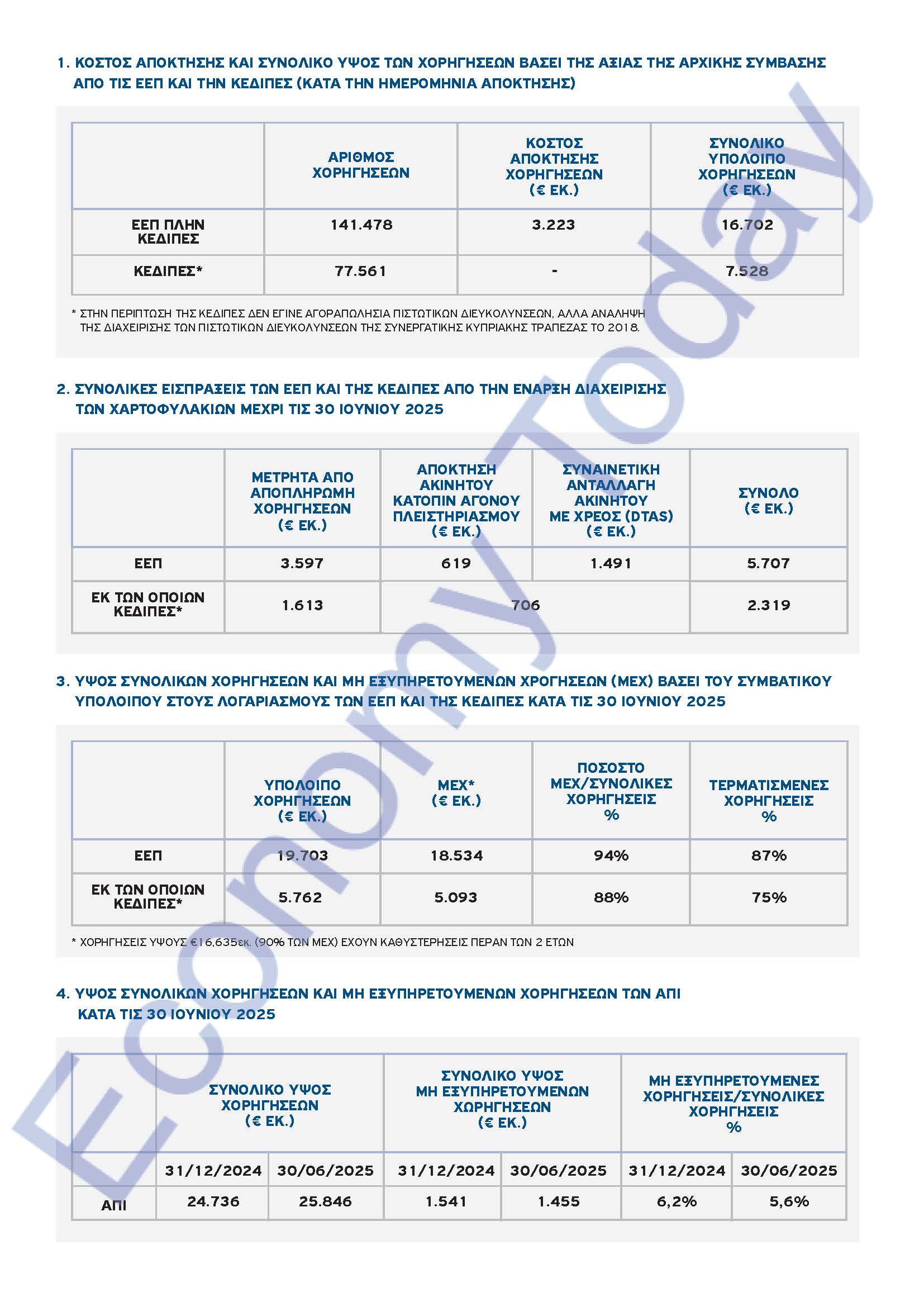 Το συνολικό υπόλοιπο των χαρτοφυλακίων στις 30 Ιουνίου 2025 διαμορφώθηκε στα €19,703 δισ., εκ των οποίων €5,762 δισ. αφορούν την ΚΕΔΙΠΕΣ. Δηλαδή, στις ΕΕΠ το υπόλοιπο του δανειακού χαρτοφυλακίου ανερχόταν στις 30 Ιουνίου 2025 στα €13,941 δισ από τα €16,702 δισ κατά την ημερομηνία μεταφοράς τους. Ως εκ τούτου, συνολικά με το αρχικό επίπεδο των €24,23 δισ. κατά την ημερομηνία μεταφοράς τους (συμπεριλαμβανομένου και της ΚΕΔΙΠΕΣ), το απόθεμα έχει μειωθεί κατά €4,527 δις κατά την ημερομηνία αναφοράς του εγγράφου. Συνεπώς, παρά το ότι το μέγεθος παραμένει ιδιαίτερα ψηλό και προβληματικό, το ονομαστικό απόθεμα μειώθηκε.