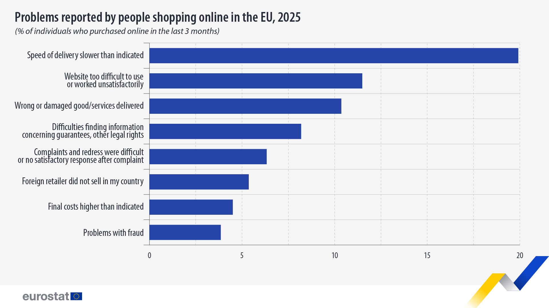 Όσον αφορά τη φύση των προβλημάτων που καταγράφονται στις διαδικτυακές αγορές, η πιο συχνή δυσκολία αφορά τις καθυστερήσεις στις παραδόσεις. Σχεδόν ένας στους πέντε καταναλωτές στην Ευρώπη, ποσοστό 19,9%, δήλωσε ότι τα προϊόντα ή οι υπηρεσίες που αγόρασε παραδόθηκαν αργότερα από τον αναμενόμενο χρόνο.