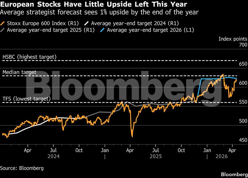 Οι ευρωπαϊκές μετοχές δύσκολα θα καταγράψουν σημαντικά περαιτέρω κέρδη μέσα στο 2026, καθώς οι υπεραισιόδοξες εκτιμήσεις για τα εταιρικά αποτελέσματα αναμένεται να αναθεωρηθούν προς τα κάτω, σύμφωνα με στρατηγικούς αναλυτές που συμμετείχαν σε έρευνα του Bloomberg. Ο δείκτης Stoxx Europe 600 εκτιμάται ότι θα ολοκληρώσει τη χρονιά περίπου 1% υψηλότερα από το κλείσιμο της Τετάρτης, στις 623 μονάδες, βάσει του μέσου όρου 17 προβλέψεων. Αν και ο δείκτης έχει σχεδόν ανακτήσει τις απώλειες που προκάλεσε ο πόλεμος με το Ιράν, οι αναλυτές επισημαίνουν ότι η ανοδική αυτή αντίδραση δύσκολα θα διατηρηθεί, καθώς οι πλήρεις επιπτώσεις του αυξημένου ενεργειακού κόστους δεν έχουν ακόμη αποτυπωθεί.