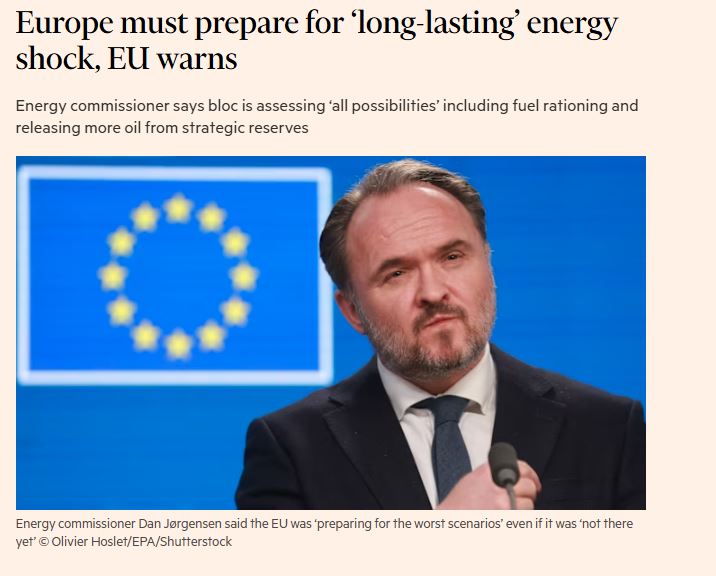 Η Ευρωπαϊκή Ένωση προετοιμάζεται για ένα παρατεταμένο ενεργειακό σοκ λόγω του πολέμου στη Μέση Ανατολή και εξετάζει «όλες τις δυνατότητες» για την αντιμετώπιση της κρίσης, όπως ανέφερε ο Επίτροπος Ενέργειας της ΕΕ, Νταν Γιόργκενσεν, σε συνέντευξή του στους Financial Times.