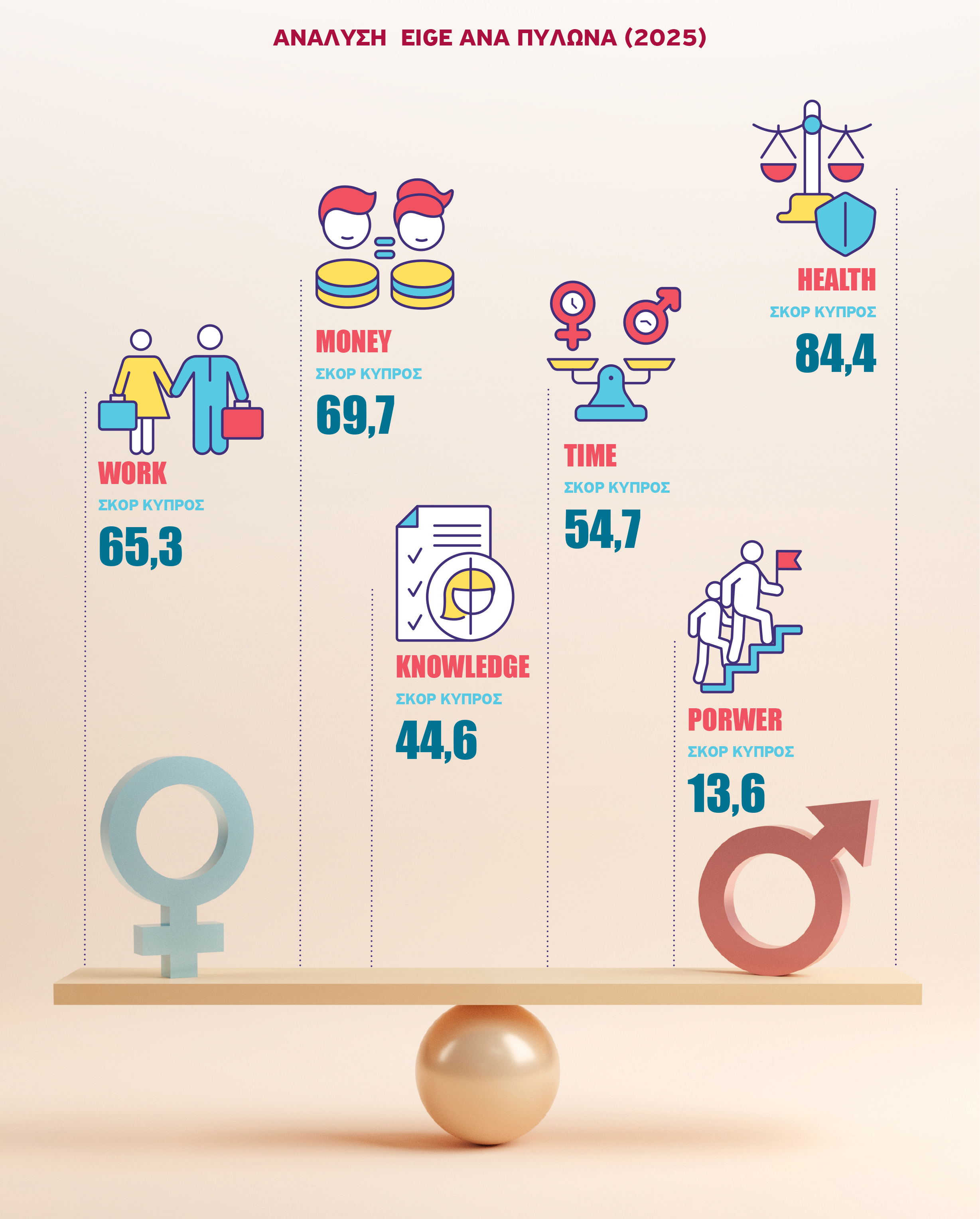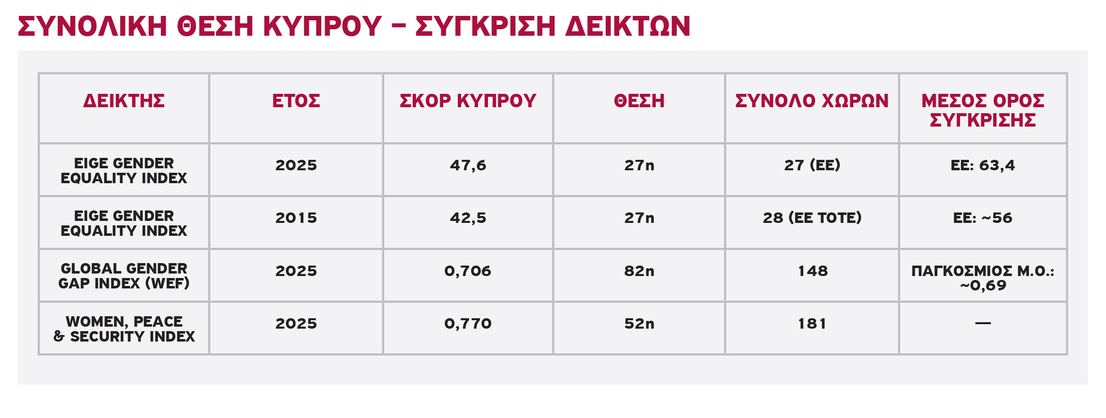 Στον Δείκτη Ισότητας των Φύλων του EIGE, που αποτυπώνει την κατάσταση εντός της Ευρωπαϊκής Ένωσης, η Κύπρος καταγράφει 42,5 μονάδες το 2015 και 47,6 μονάδες το 2025. Η αύξηση των 5,1 μονάδων σε δέκα χρόνια δείχνει βελτίωση. Αν ληφθεί ως αφετηρία το 2010, όταν η χώρα βρισκόταν στις 39,7 μονάδες, η συνολική άνοδος φτάνει τις 7,9 μονάδες. Ο μέσος όρος της Ε.Ε. όμως αυξάνεται από περίπου 56 μονάδες σε 63,4 μονάδες την ίδια περίοδο. Η Κύπρος παραμένει στις τελευταίες θέσεις της Ε.Ε., παρά τη μεταβολή προς τα πάνω.