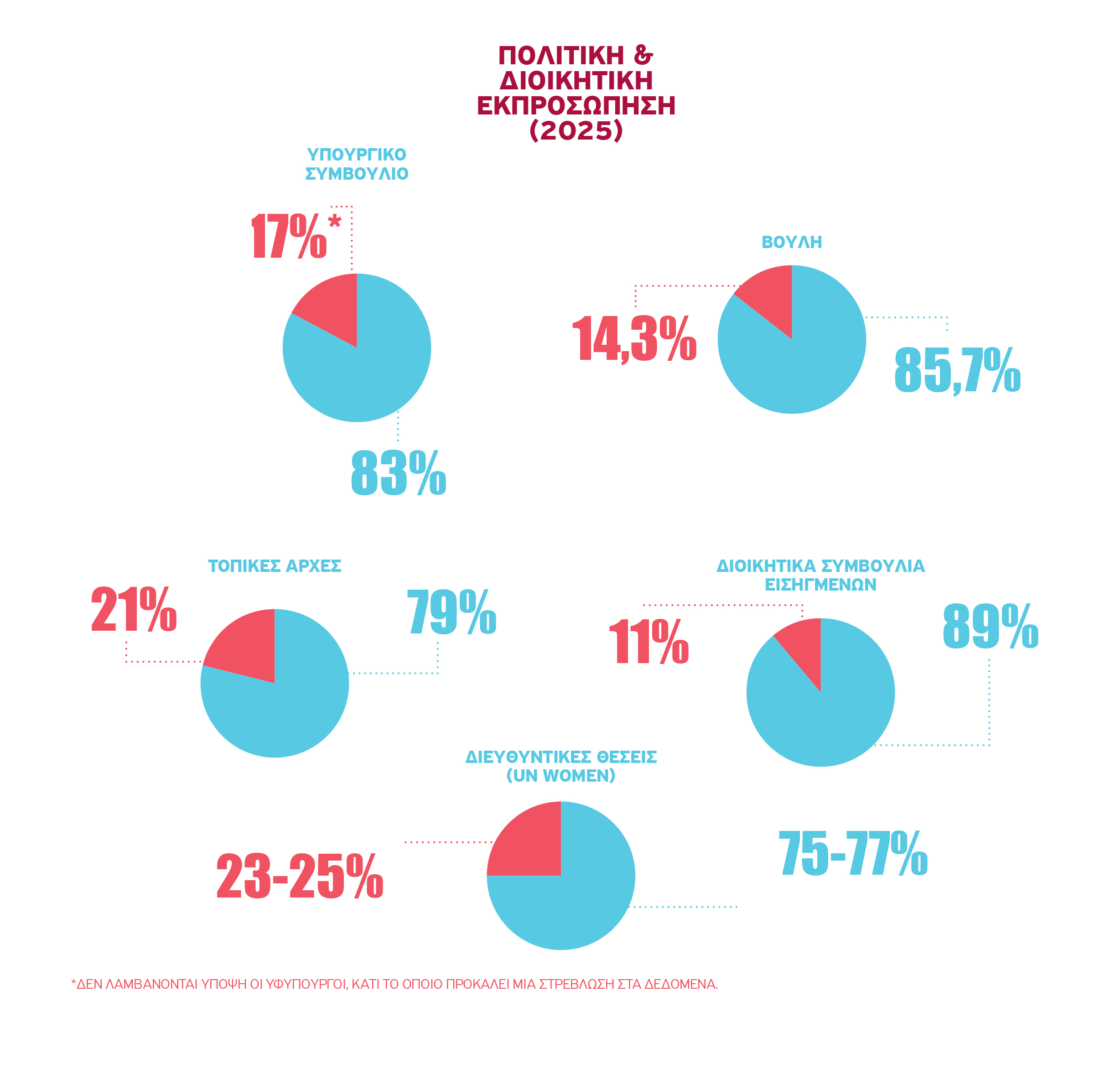Στα στοιχεία του UN Women, οι γυναίκες κατέχουν περίπου 23%–25% των διευθυντικών θέσεων, ενώ η παρουσία τους σε ανώτερες διοικητικές βαθμίδες παραμένει χαμηλότερη από την αναλογία τους στο εργατικό δυναμικό.