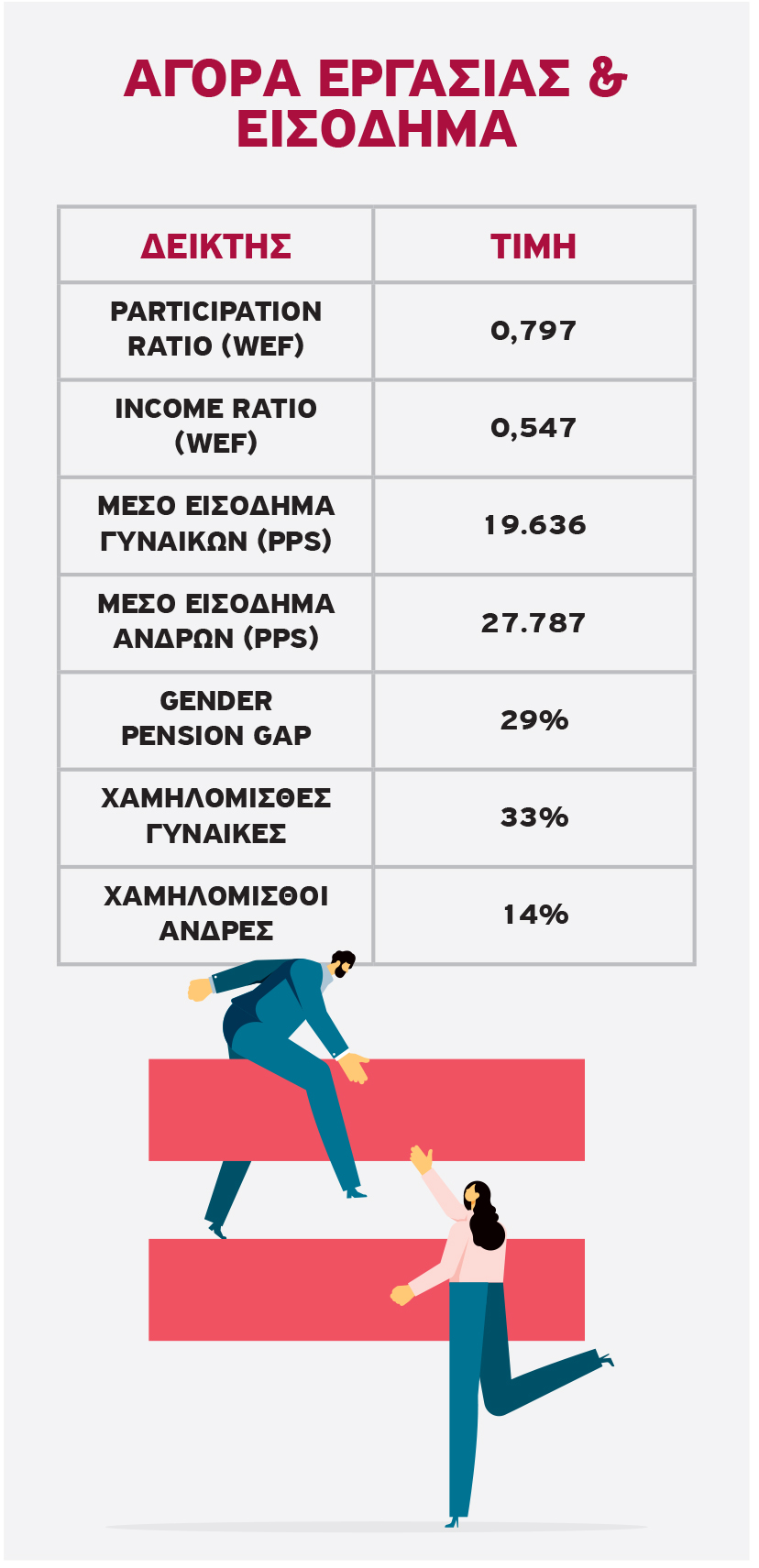 - Η αναλογία αποδοχών γυναικών προς ανδρών παραμένει στο 0,547.