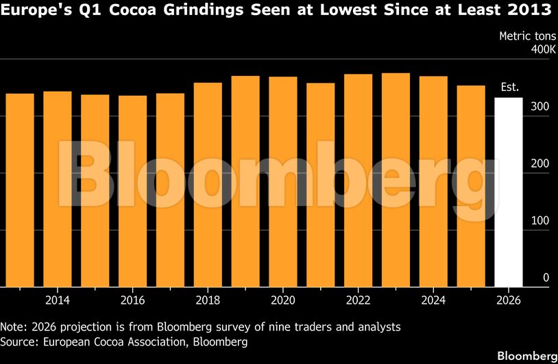 Στην Ευρώπη, τον μεγαλύτερο καταναλωτή παγκοσμίως, η επεξεργασία κακάο εκτιμάται ότι μειώθηκε κατά 6% το πρώτο τρίμηνο σε σύγκριση με πέρυσι, καταγράφοντας το χαμηλότερο επίπεδο για το αντίστοιχο διάστημα από το 2013, σύμφωνα με έρευνα του Bloomberg σε εννέα traders και αναλυτές.