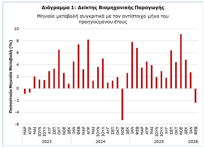Ο Δείκτης Βιομηχανικής Παραγωγής για τον μήνα Φεβρουάριο 2026 έφθασε στις 108,4 μονάδες (βάση 2021=100), σημειώνοντας μείωση 2,4% σε σύγκριση με τον Φεβρουάριο 2025, σύμφωνα με στοιχεία που ανακοίνωσε σήμερα η Στατιστική Υπηρεσία. Κατά την περίοδο Ιανουαρίου – Φεβρουαρίου 2026, ο δείκτης παρουσίασε αύξηση 0,1% σε σύγκριση με την αντίστοιχη περίοδο του προηγούμενου έτους.