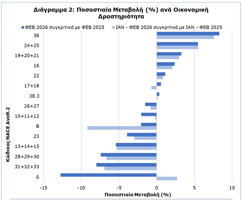 Συγκρίνοντας τους ρυθμούς μεταβολής για την περίοδο Ιανουαρίου – Φεβρουαρίου 2026 με την αντίστοιχη περίοδο του προηγούμενου έτους, οι σημαντικότερες αυξήσεις παρατηρούνται στη συλλογή, επεξεργασία και παροχή νερού (+7,6%), στην παραγωγή βασικών μετάλλων και κατασκευή μεταλλικών προϊόντων (+5,5%), στην παραγωγή προϊόντων διύλισης πετρελαίου, χημικών ουσιών και προϊόντων και φαρμακευτικών προϊόντων και σκευασμάτων (+3,0%) και στην παροχή ηλεκτρικού ρεύματος (+2,7%). Οι δραστηριότητες στις οποίες παρατηρούνται σημαντικές μειώσεις στην παραγωγή συγκριτικά με την περίοδο Ιανουαρίου – Φεβρουαρίου 2025 ήταν αυτές των μεταλλείων και λατομείων (-9,2%), της κατασκευής επίπλων, άλλες μεταποιητικές δραστηριότητες και επισκευή και εγκατάσταση μηχανημάτων και εξοπλισμού (-6,9%), της κατασκευής μηχανημάτων και ειδών εξοπλισμού, μηχανοκίνητων οχημάτων και λοιπού εξοπλισμού μεταφορών (-6,7%) και της παραγωγής κλωστοϋφαντουργικών υλών, ειδών ένδυσης και δερμάτινων ειδών (-5,3%).