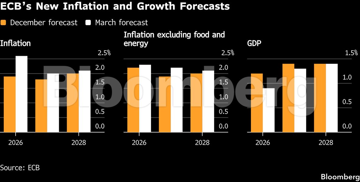 Οι νέες προβλέψεις της ΕΚΤ δείχνουν ότι οι τιμές καταναλωτή θα αυξηθούν κατά 2,6% στη ζώνη του ευρώ φέτος — σημαντικά περισσότερο από ό,τι εκτιμάτο προηγουμένως. Σε ένα ακραίο σενάριο, όπου οι διαταραχές στην προσφορά πετρελαίου και φυσικού αερίου διατηρηθούν έως τα τέλη του 2026, ο πληθωρισμός θα κορυφωθεί στο 6,3% το πρώτο τρίμηνο του 2027.