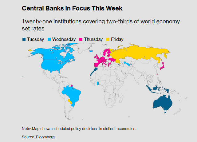 «Οι κεντρικές τράπεζες μπορούν να καθορίσουν τα επιτόκια — δεν μπορούν να ανοίξουν ξανά τα Στενά του Ορμούζ», δήλωσε ο Τομ Όρλικ, επικεφαλής οικονομολόγος του Bloomberg Economics. «Αναμένεται ότι οι Πάουελ, Λαγκάρντ, Μπέιλι και άλλοι θα διατηρήσουν τα επιτόκια αμετάβλητα, θα εκφράσουν επαγρύπνηση και θα ελπίζουν ότι ο πόλεμος στο Ιράν θα τελειώσει πριν δημιουργήσει ένα ακόμη πρόβλημα πληθωρισμού που δεν είναι προετοιμασμένοι να αντιμετωπίσουν.»