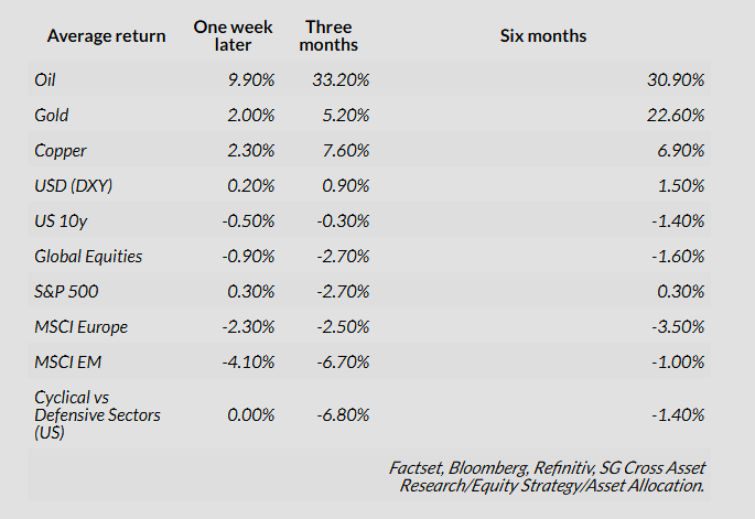 Η ιστορία δείχνει ότι οι μετοχές των ΗΠΑ τείνουν να υπεραποδίδουν σε σχέση με τις διεθνείς ομολόγους τους κατά τη διάρκεια αυτών των επεισοδίων. Το δολάριο ΗΠΑ και ο χρυσός τείνουν επίσης να ενισχύονται.