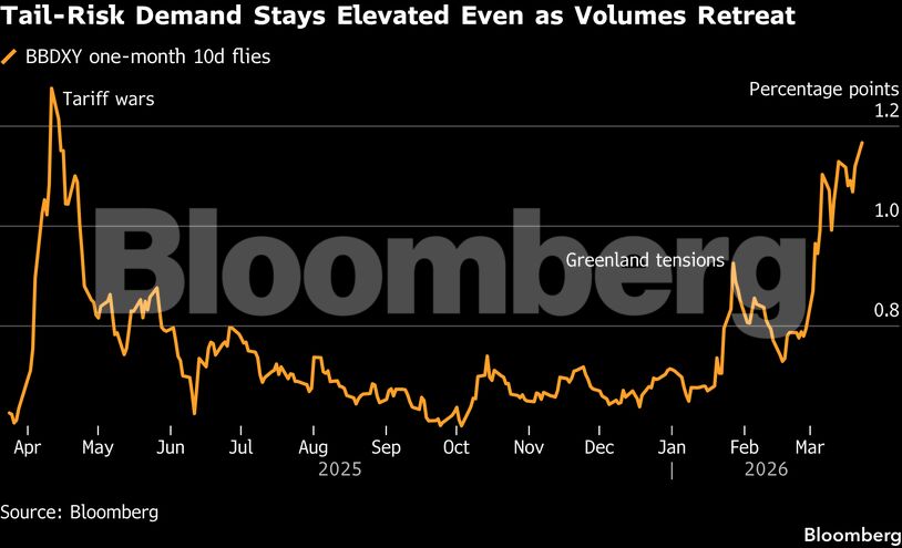 Ενδεικτικό είναι και το σήμα από τα λεγόμενα risk reversals, που αποτυπώνουν το κόστος αγοράς έναντι πώλησης ενός νομίσματος στην αγορά options. Το premium υπέρ της ανόδου του δολαρίου διευρύνθηκε τη Δευτέρα, ενώ αυξημένη είναι και η ζήτηση για στρατηγικές προστασίας έναντι απότομων κινήσεων.