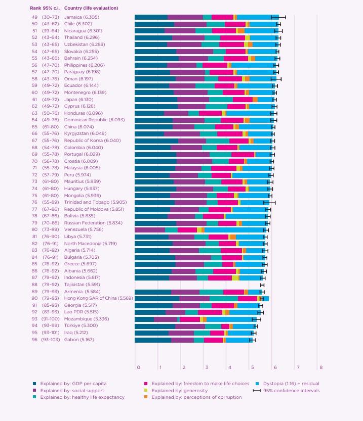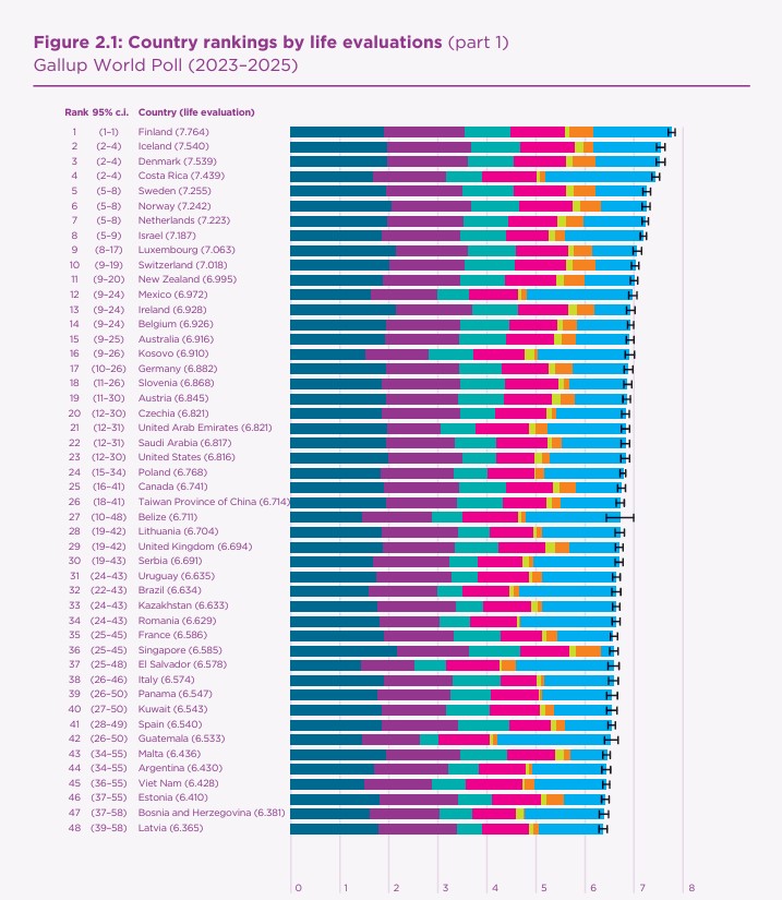 Με μέση βαθμολογία 6,126 στην κλίμακα αξιολόγησης ζωής (0-10), η Κύπρος κατατάσσεται στην 62η θέση παγκοσμίως, πίσω από χώρες όπως η Γερμανία, η Αυστρία και η Ιρλανδία, αλλά και αρκετά κάτω από τις σκανδιναβικές χώρες που συνεχίζουν να κυριαρχούν.