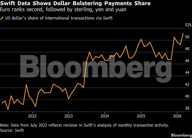 Το μερίδιο του δολαρίου στις διεθνείς συναλλαγές αυξήθηκε στο ρεκόρ του 51,1% τον Μάρτιο, από 49,2% τον προηγούμενο μήνα, σύμφωνα με τα τελευταία στοιχεία που συγκέντρωσε η παγκόσμια υπηρεσία χρηματοοικονομικών μηνυμάτων Swift.