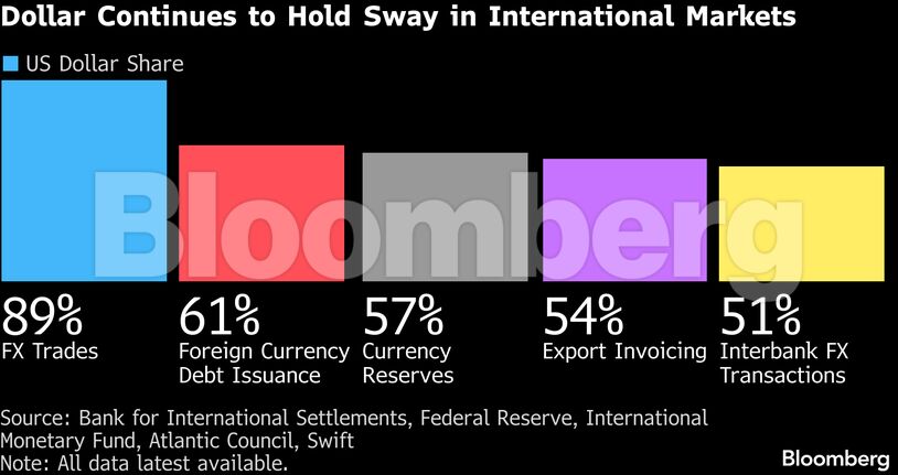 Οι μεγάλες παγκόσμιες τράπεζες χρησιμοποιούν την υπηρεσία Swift για να επικοινωνούν μεταξύ τους και να διευκολύνουν τις διατραπεζικές συναλλαγές. Το κύριο αποθεματικό νόμισμα του κόσμου ακολουθήθηκε από το ευρώ, το οποίο κατείχε μερίδιο περίπου 21% μέσω του Swift, και στη συνέχεια από τη στερλίνα, το γιεν, το κινεζικό γουάν και το καναδικό δολάριο.